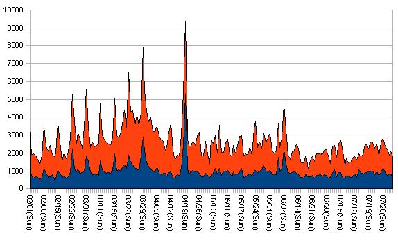 半年間の推移ですが、アニメ終わってから落ち着いてきましたね。日曜日に一気に増えて平日は落ち着くということもなくなり、平均的にトータルが2000ぐらい、ユニークがその1/3ぐらいでしょうか。