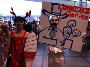 去年は名古屋といえば手羽先、「世界の山ちゃん」のコスプレ、その前の年は矢場とんをされていた人がいらっしゃいましたが今年も同じ方でしょうか。今年は喫茶店王国名古屋といえばということでコメダ珈琲と寿がきやのスーちゃんのコスプレをされている方がいましたね。ご当地コスプレ大好きですw あともう一つあったのが電波女と青春男の簀巻き女ですね。見たこと有りませんが舞台が名古屋だということで一応ご当地かな?それにしても苦しそうで、付き添いの方がいないと進めませんし、時間的にも短時間しか活動できないようで、行動が面白かったですw
