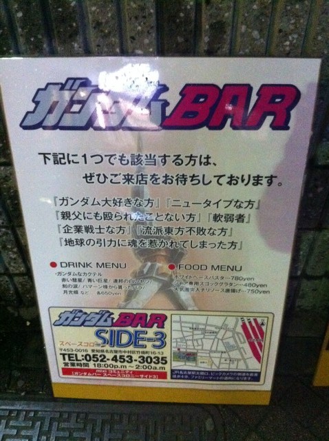 系列はガンダムバーSIDE-3と同じ系列のお店のようです。こう言うのは同じ方が経営するのが多いのかな?栄のジョジョの奇妙な冒険、バキ、カイジをコンセプトにしたバー「スタープラチナ」と「アニソンバー綾波」も同一店舗にあるようですし、そのほうがやりやすいのかな。