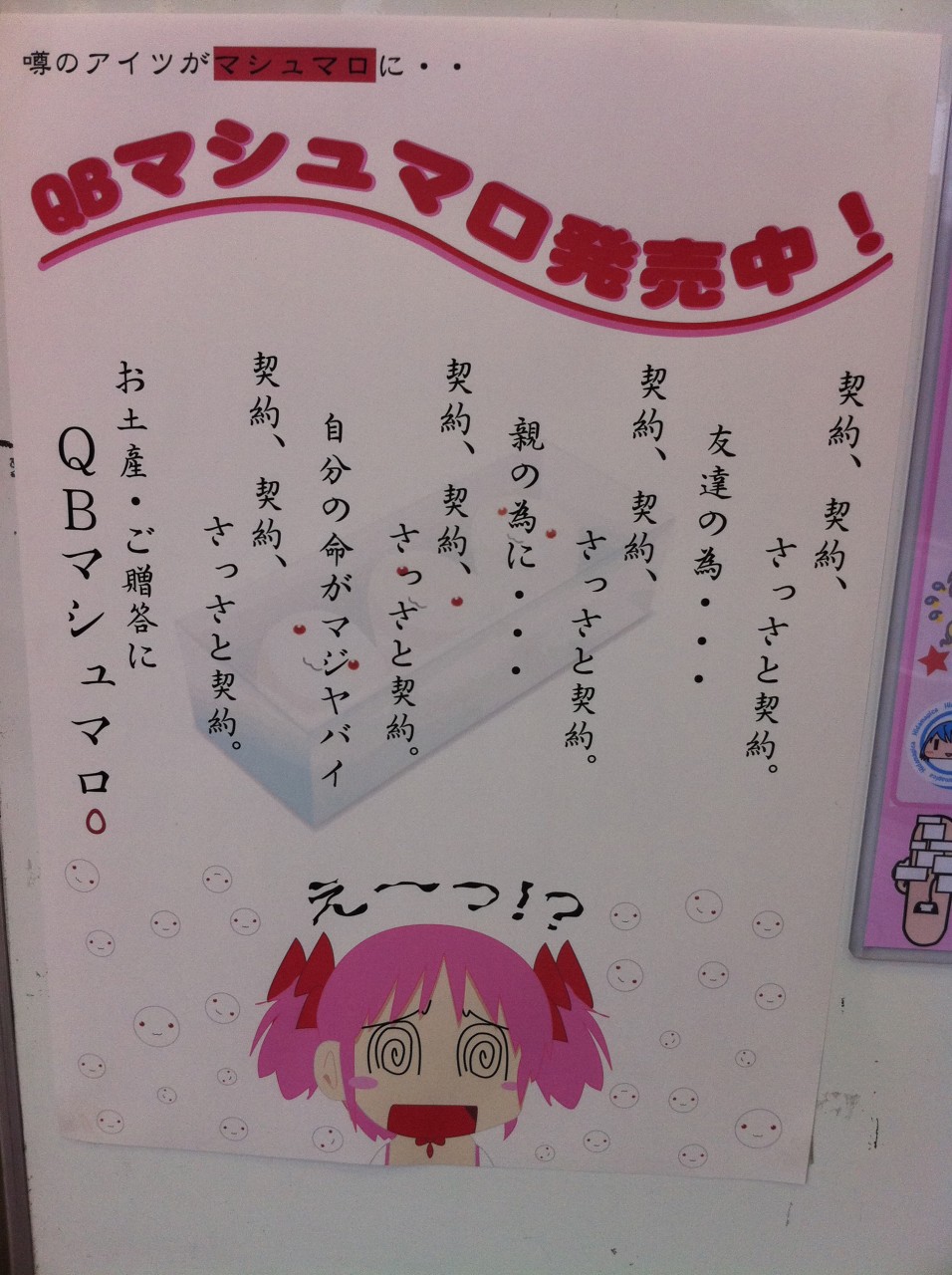 契約!契約!さっさと契約!シバクぞーとなつみん先生のQBまんがでも描かれた引越しおばさんを連想させる広告となっていますね。魔法少女まどかマギカの商品でこういうモノもあるのだなと歩いていて笑ってしまいました。他のサイト調べたら3個入り630円のようですね。同じものだとは思いますが、実際見て確かめてみてください。