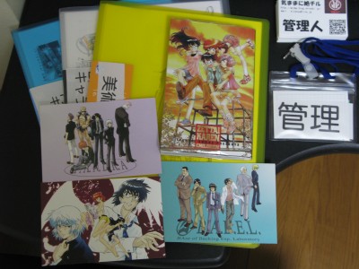 用意したネタは画像のようにクリアファイルに名刺に本、ポストカードです。