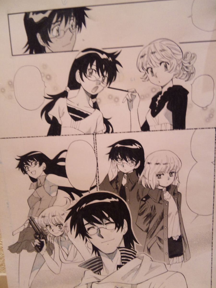 2コマ目の椎名先生と絵柄が違う部分はアシスタントさんの担当コマで後でPCでCG合成していると思われますので空白になっております。1コマ目の入り口の扉も別描きで上の方に印刷に写らない青文字で背景別紙です。と描かれています。あとは服のトーンの指定が青文字で描かれています。上のコマは紫穂の箇所は「1210」 葵は「チェック」、下のコマはちさとちゃん「千鳥」東野「62」紫穂「1210」薫「62」葵「61」ですかね。数字が点の細かさになっているのかな。
