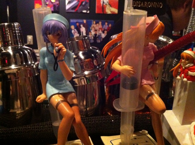 お店の中はEVAのフィギュアやグッズが沢山置いてあります。それらを手にとって語るのもいいのではないでしょうかね。LDのジャケットは久々に見たな。飾るには最適かもしれません。メニューは人類補完計画になっており、キャラや内容をもじった物が豊富にありました。アルコールの強さはシンクロ率で記載されており400%をピークにだいたい後は÷4ぐらいの度数で見てもらえばというおはなしでした。