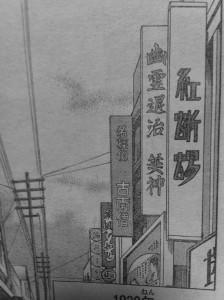 「紅蜥蜴(ベニトカゲ)」椎名先生のツイートから察して大神一郎奮闘記 〜サクラ大戦歌謡ショウ「紅蜥蜴」より〜という可能性があります。もとは江戸川乱歩の探偵小説である黒蜥蜴を元に作られているということもあり、その後ろの後ろの看板は「名探偵 古南僧」と名探偵コナンとなっております。その前は「幽霊退治 美神」(GS美神)コナンの後ろは「疾風の如し」(ハヤテのごとく)ですよね。でも一番大きい「アニレナ カンナ」がわからないな。