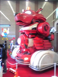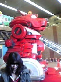 歩きながら撮ったのでぶれぶれですが、ヤッターワンの左右後ろです。映画で使っていたというだけありちゃんとできています。全長5・5メートル。製作費3000万円とのこと20世紀少年の万博記念公園の太陽の塔は費用約8000万円のようですしCMてとても大切なんですね。これで元が取れるのだから...