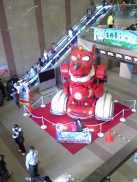 ということで名古屋に行ったついでに見てきました。まぁはっきり言ってものすごい人すぎてみる気になれません。正面からの写真撮影は一人2枚で一組ずつということで多分あれは1時間待ちじゃすまないでしょう。今のご時世、無料という言葉に皆さん必死です。見てのとおりすばらしいぐらい皆さん言うことを聞いていますのでヤッターワンの周りに人はいません。さすが電力会社、無料でも警備員の数は半端ありません。なにかあったらすぐニュースですからね。はっきり言えばお客が悪いのですがね。ということで遠くからの写真しかありません。デジカメでも持っていけばよかったとちょっと後悔です。