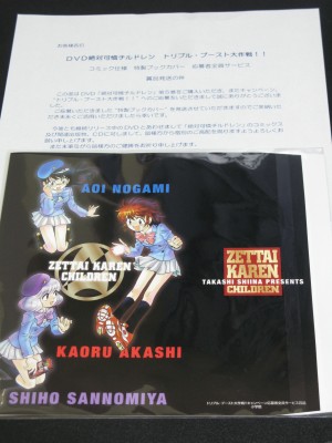 昨日は新歓で書けませんでしたがDVD絶対可憐チルドレン トリプル・ブースト大作戦!!のコミック仕様 特性ブックカバー 応募者全員サービスが届いていました。葉書を5枚出したのですが一人一つのようです。残念。まだ椎名先生の生原稿やアフレコ台本が届いたとかそういう記事は見ないのでこれからですかね。当たっていますように。