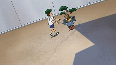 なぜか植木を運ぶ少年とその頭の木。