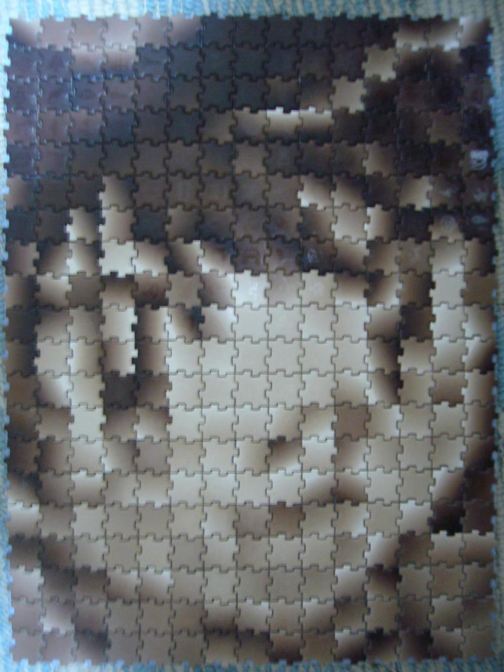 携帯で顔写真を送るとパズルの組み立て方の回答図が来て、それを組み立てると顔となるそうです。