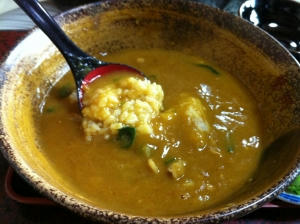 2:器の底から、ご飯、とろろ、カレーうどんの順に盛る。