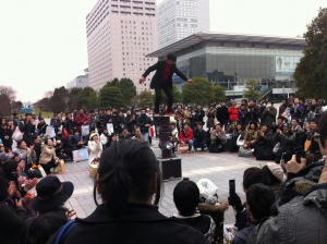 開場をあとにして、駅に向かうと大道芸の方が実演中でした。この方のすごいところは、オタク受けする、単語を織り交ぜているところですね。お客さんも受けが良く、やっていることもすごかったので、お金が入ること入ること、福沢さんや新渡戸さん、野口さんがゴロゴロと、正直こんなにお札が入っているのは見たことありませんでしたね。コミケに来るオタク狙いの商売が儲かるのは分かるわと思ってしまいました。